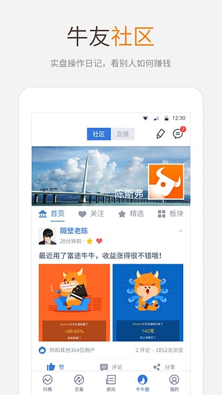 富途牛牛股票是目前全国互联网股民使用最多的小程序,极速快捷,它可以免费炒股投资,免费看美股、港股、A股三大市场实时行情,并且提供了社交功能,看盘聊天挖牛股,结识股神,让投资者不再无趣!通过富途牛牛开通美股和港股的投资账户开始T+0的日程,港股更可以享受0佣金! 富途牛牛股票小程序主要功能: 1、看行情:A美港三大市场深度报价免费浏览! 2、做交易:有免佣!真正不用0佣金的炒股! 3、玩模拟:快速上手,参加比赛还能赢奖金! 4、聊天室:看高手晒收益,和朋友聊炒股! 6、条件单:提前指